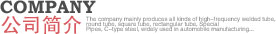 本公司主要生产各种规格的高频焊管,圆管,方管,矩形管,异型管,C型钢管,广泛用于汽车制造,家具制造,车辆、车架、机械制造、工业厂房、防盗门窗等多类行业,本公司产品采用优质钢材制造,各类物化指标均达到标符,产品畅销全国各地,深受客户好评。